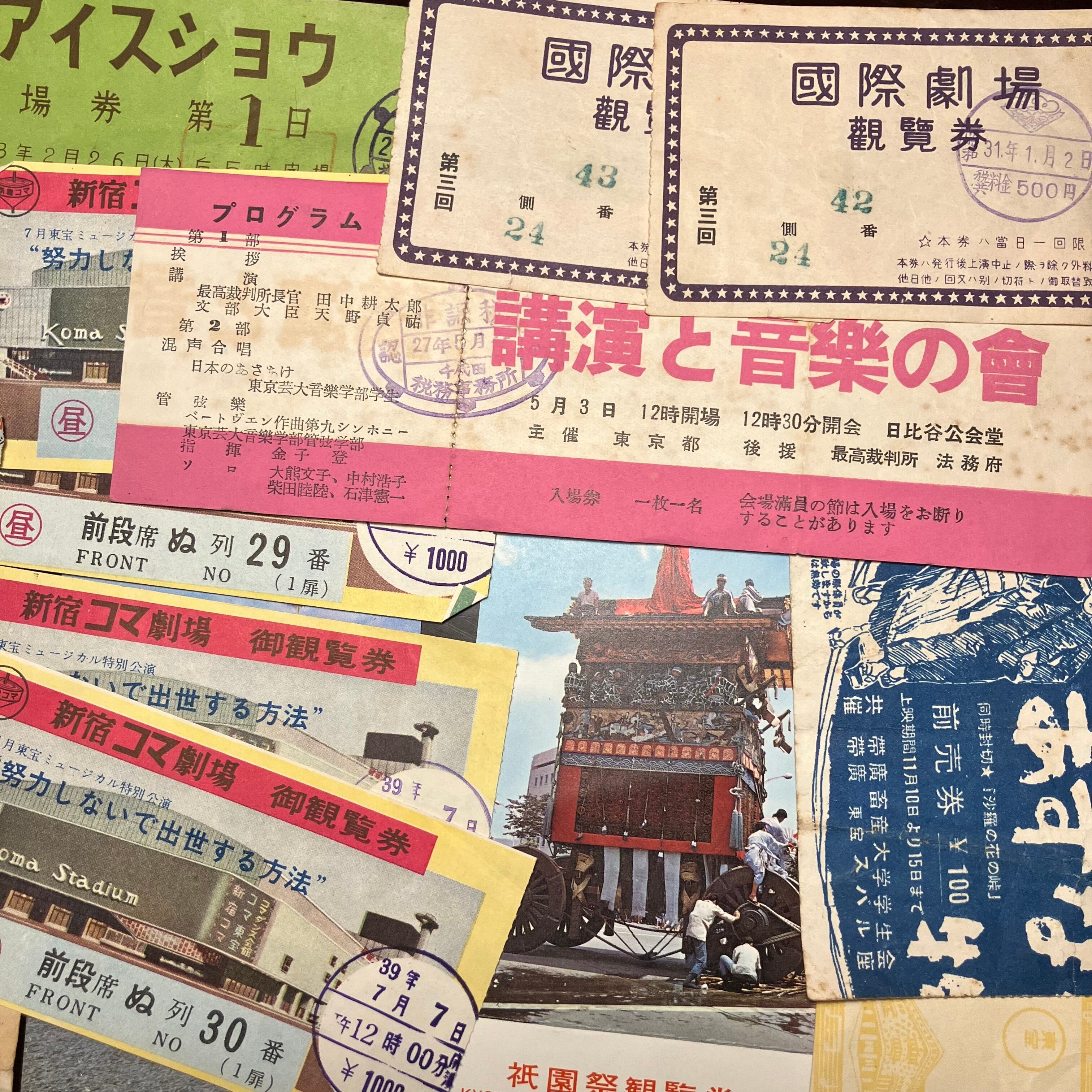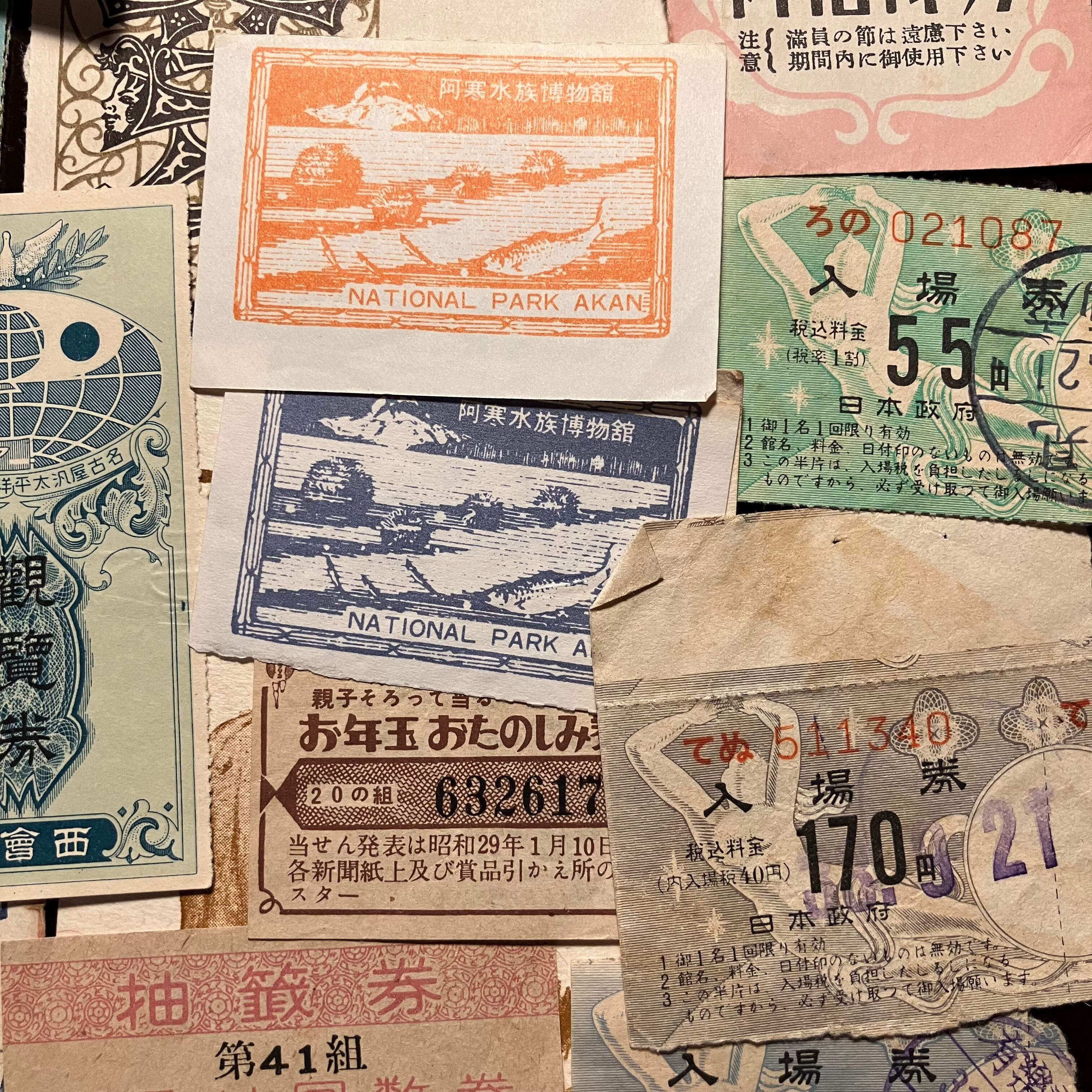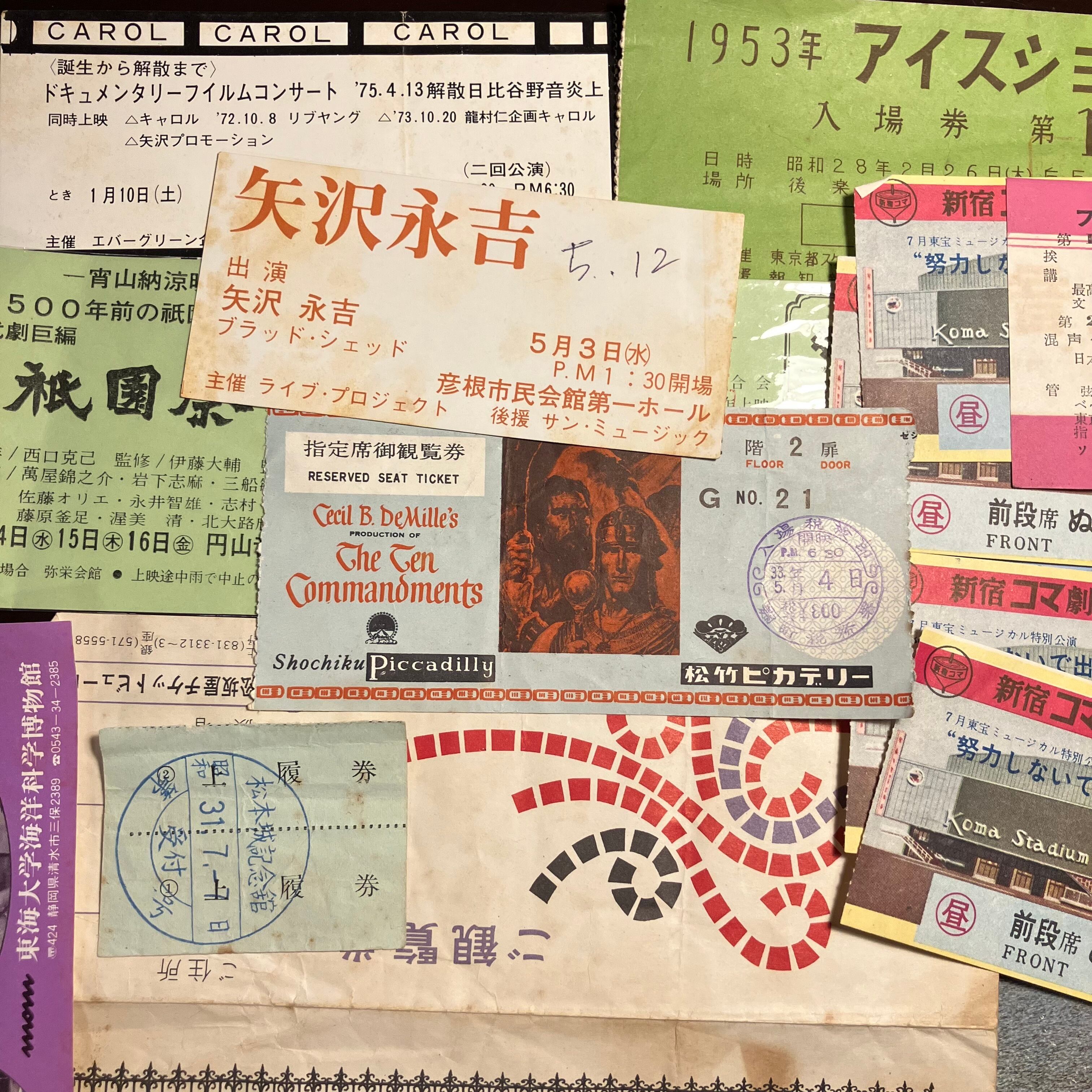 東京都交通局景品付き回数券、非売品御招待券、阪急ブレーブス主催試合外野席観覧券(西京極球場)、阿寒水族博物館、矢沢永吉、國際劇場観覧券、‘70大阪万博入場券、越前松島水族館入場券、日本劇場指定席入場券、ドリームランド入園券、松竹会館開場記念ラッキーカード、有楽座指定席入場券