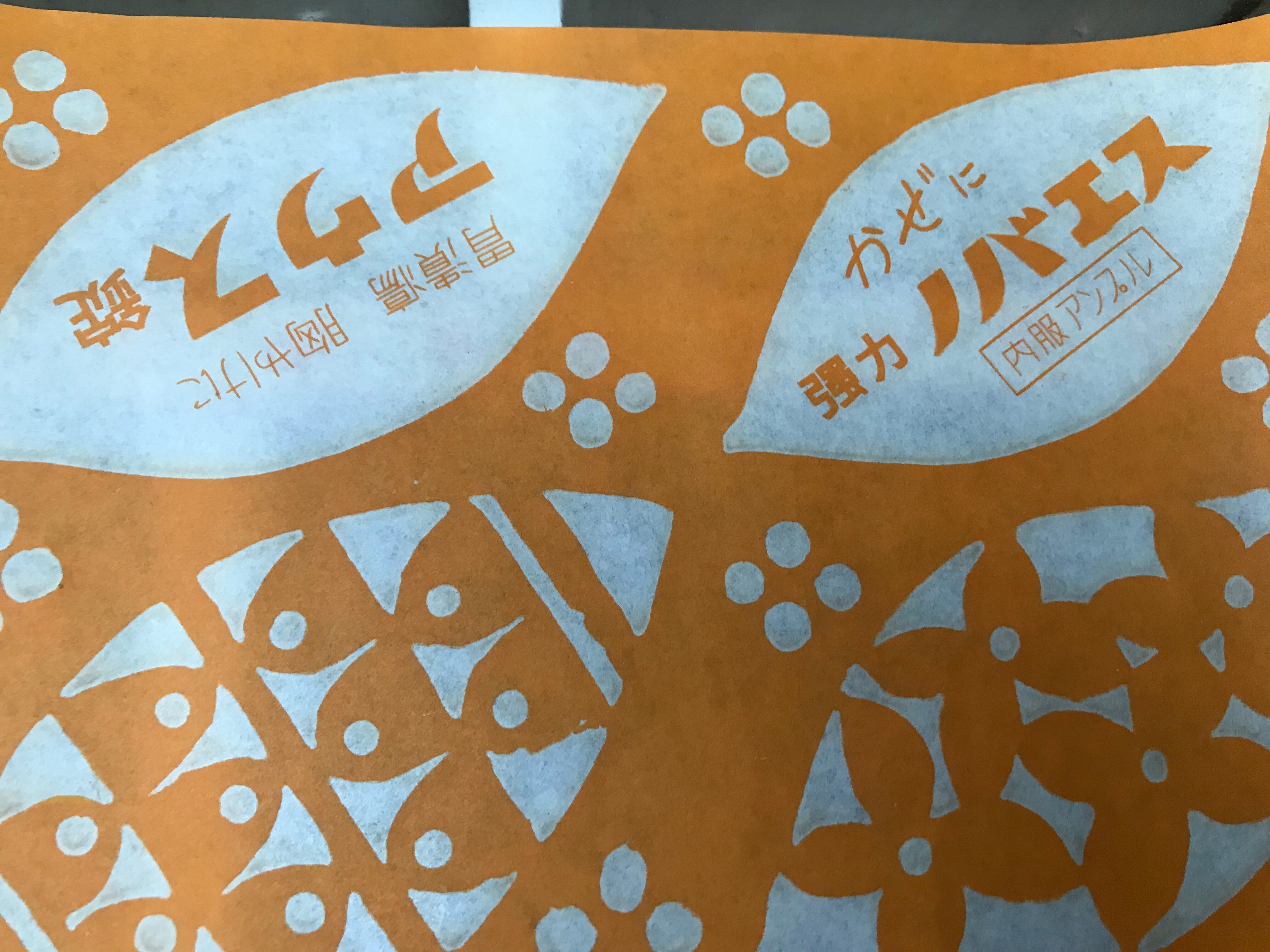 約27×38.5センチ。広島県福山市「森田薬品」の包装紙です。葉っぱのデザインがとても可愛いですね!個人的には「乗り物酔い ノイロミン」に更にグッときます。昭和4〜50年代頃のものと思われます。