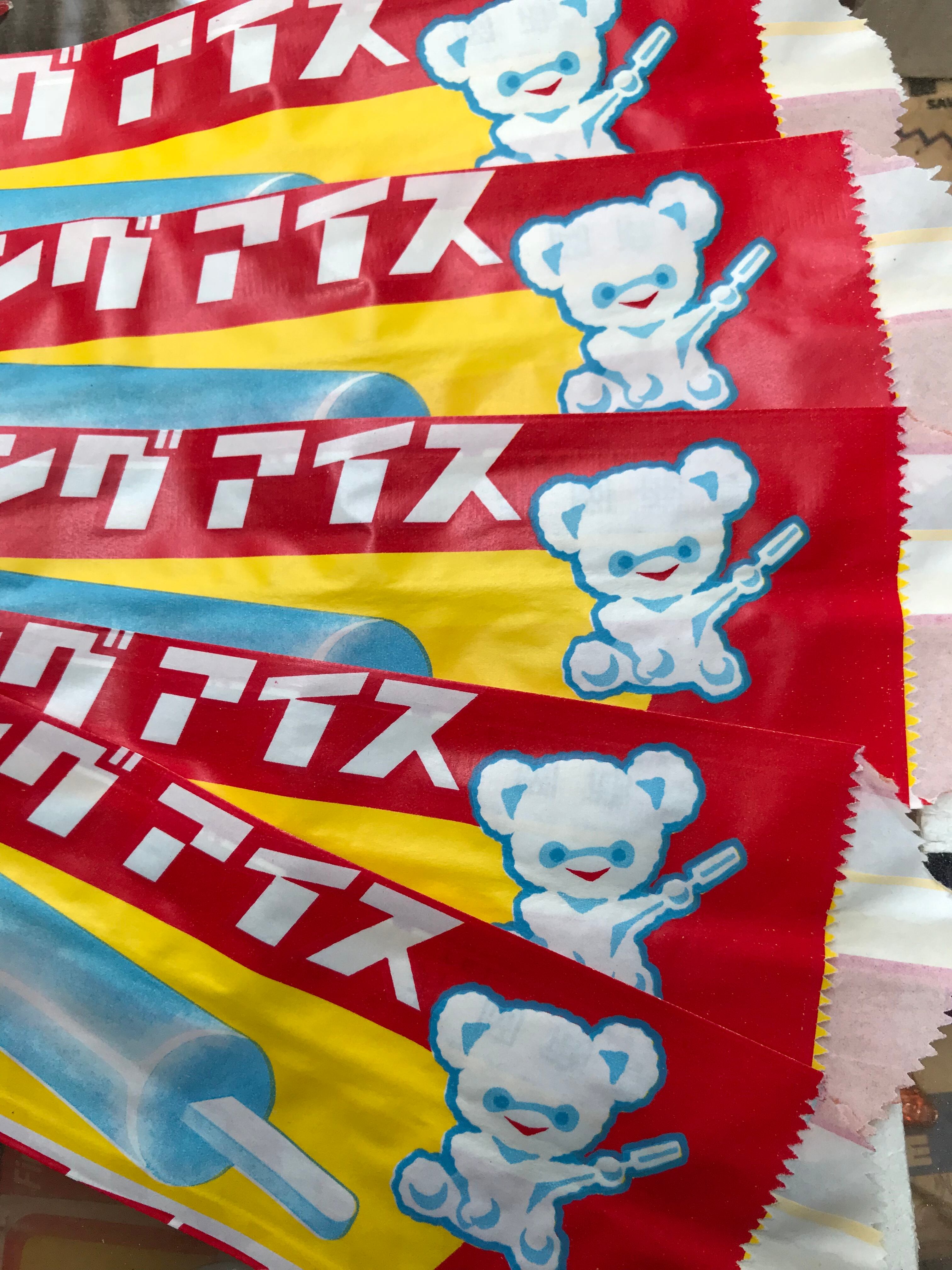 アイスを持った白クマがとても可愛い、新潟県新初田市「井岡商事」の「ロングアイス」の袋です。昭和30年代頃のものと思われます。