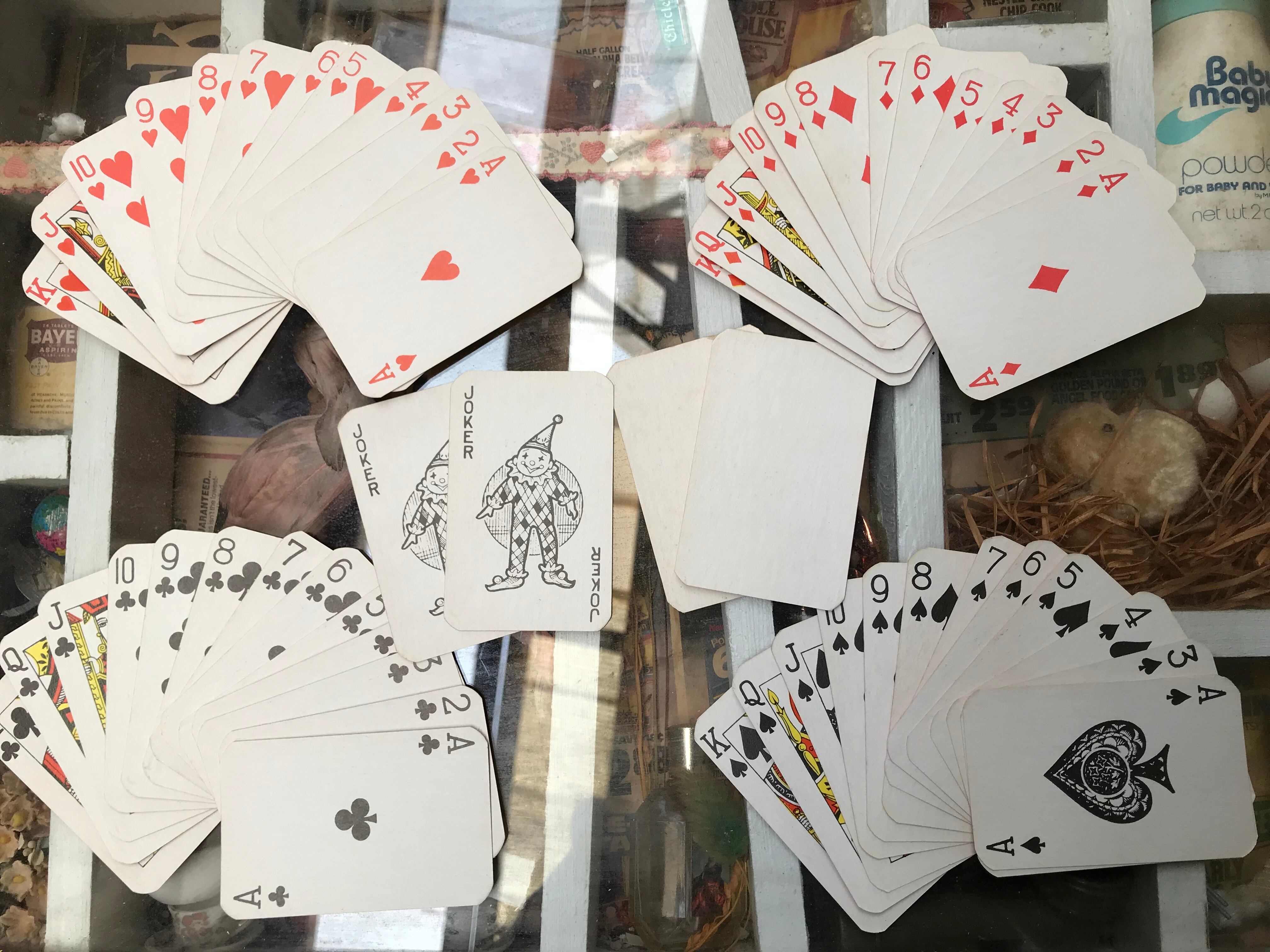 宇宙の鉄道を舞台にした冒険漫画風のトランプです。女性の髪や睫毛、少年の表情の雑さがとても良いです。背景に機関車や飛行機の写真が適当にコラージュされてるのも、とても良いです。