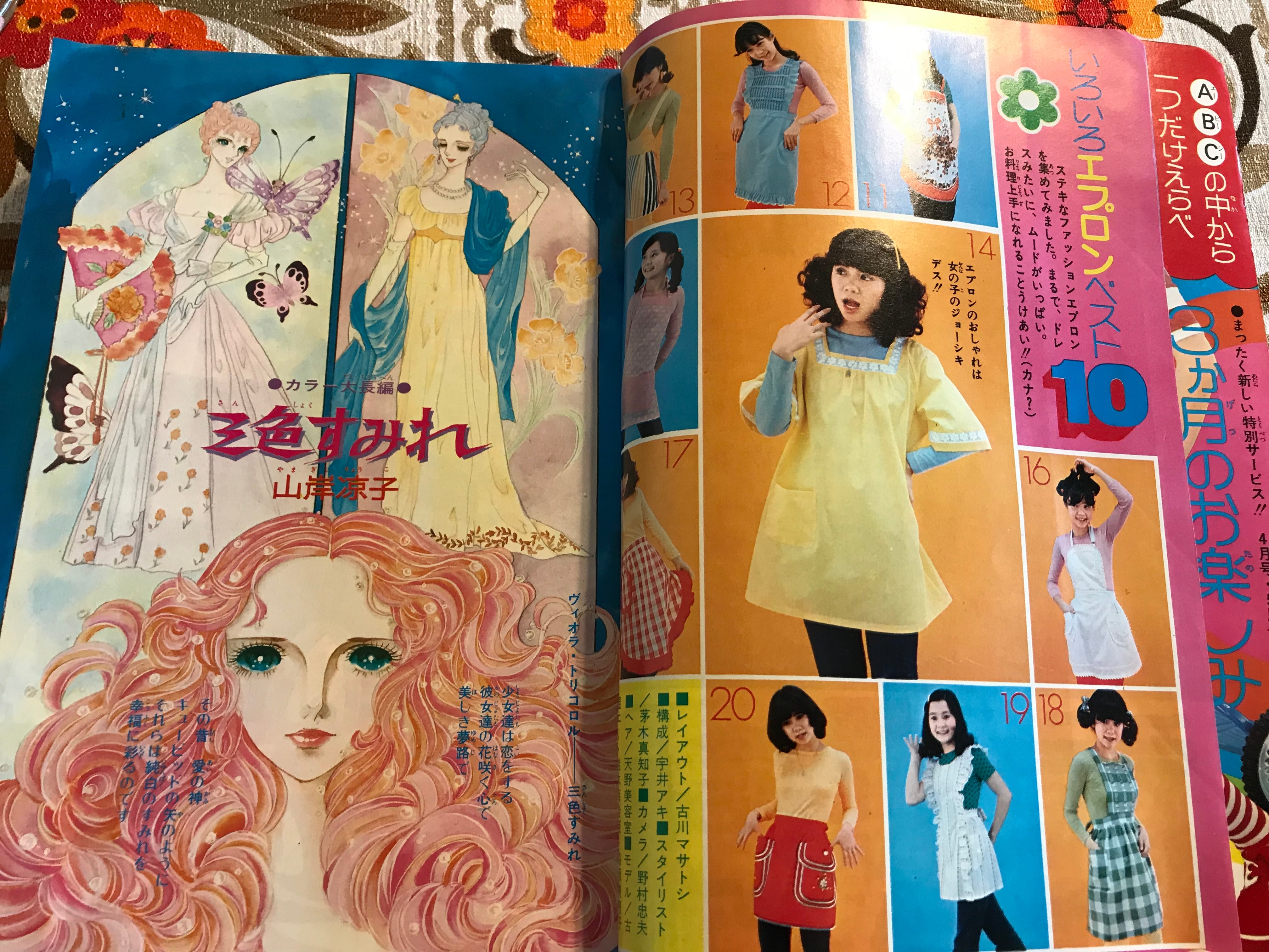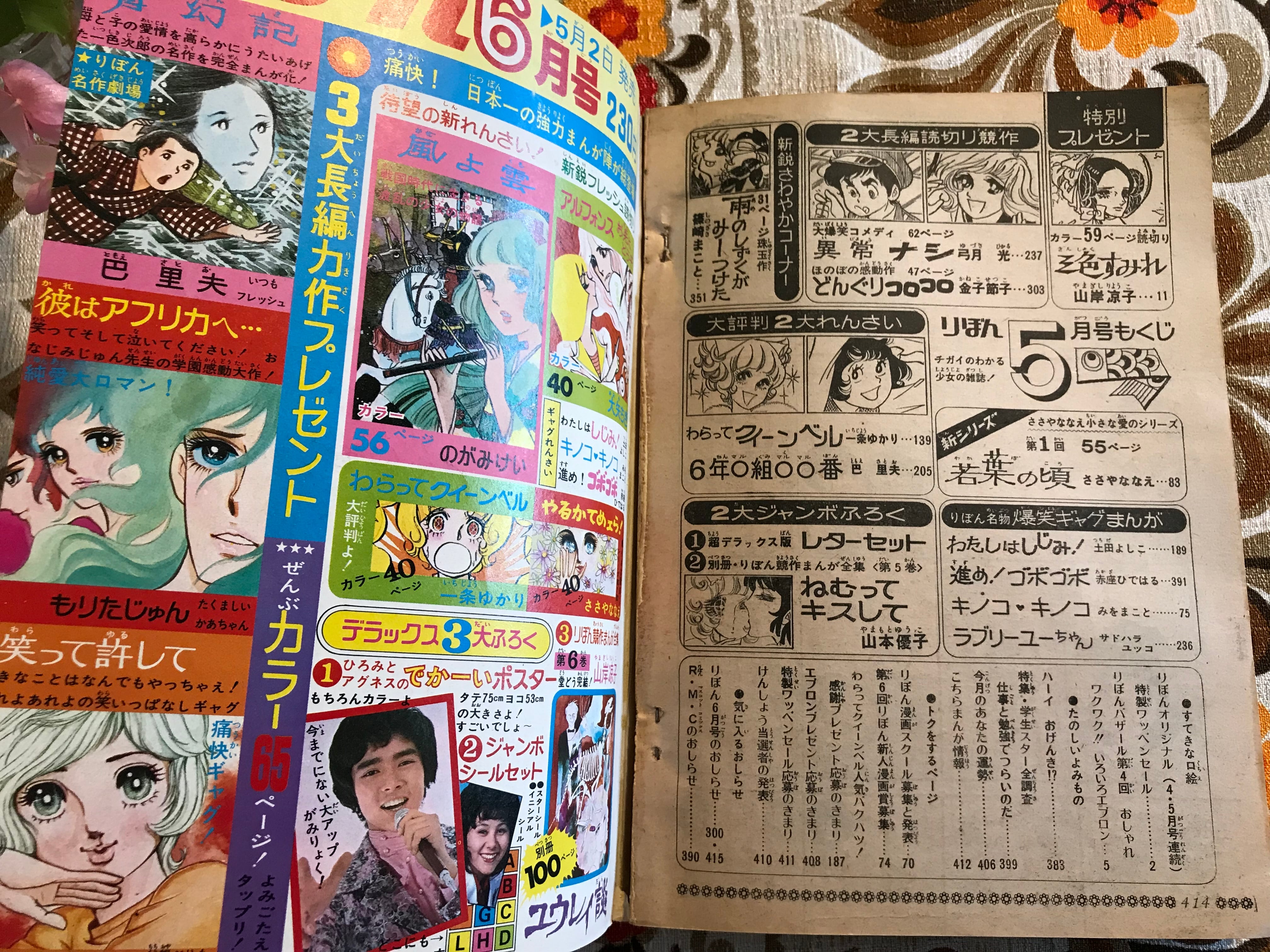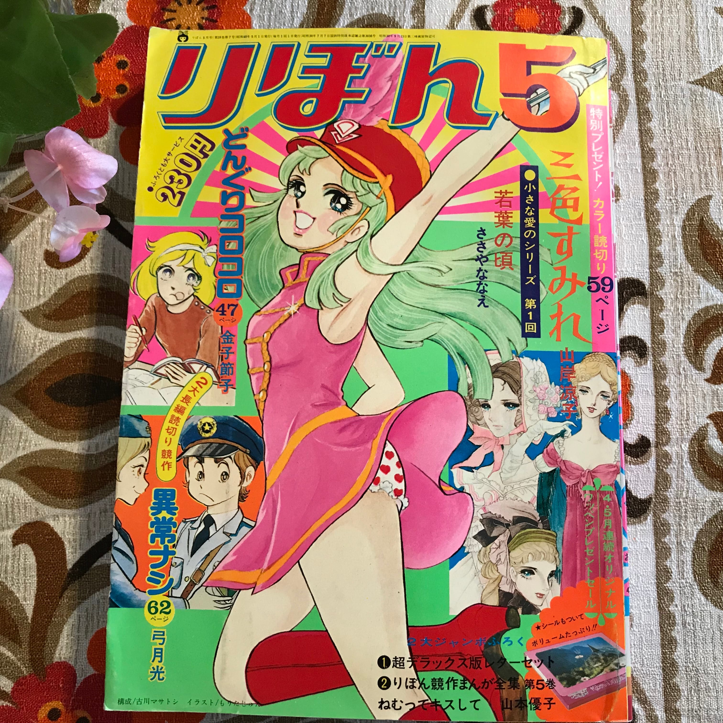73年「りぼん」5月号(最終回!「6年○組〇〇番」巴里夫・新連載「若葉の頃」ささやななえ・読切「三色すみれ」山岸涼子・読切「雨のしずくがみーつけた」篠崎まこと・金子節子・巴里夫・弓月光・一条ゆかり・土田よしこ)昭和レトロ 少女漫画 広告