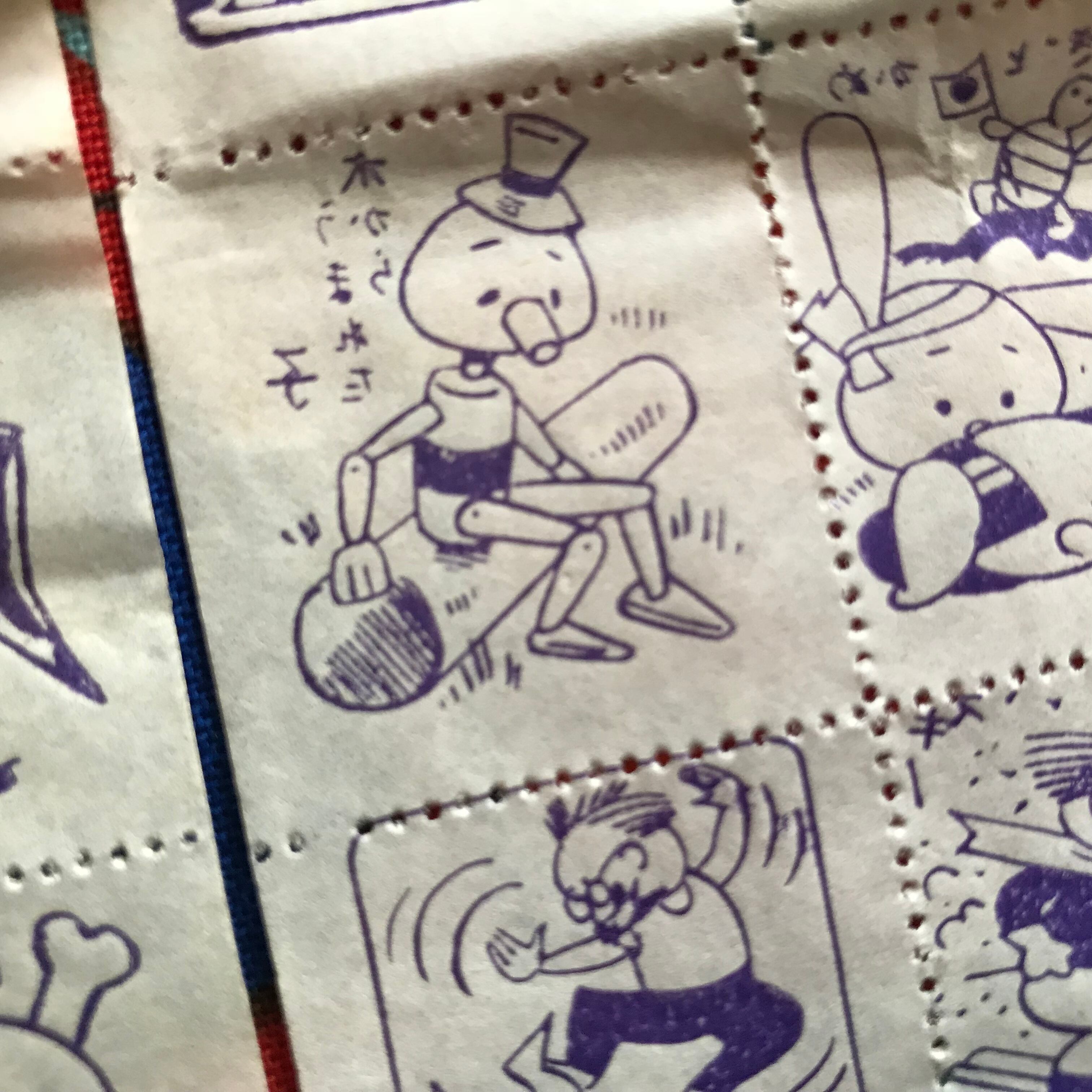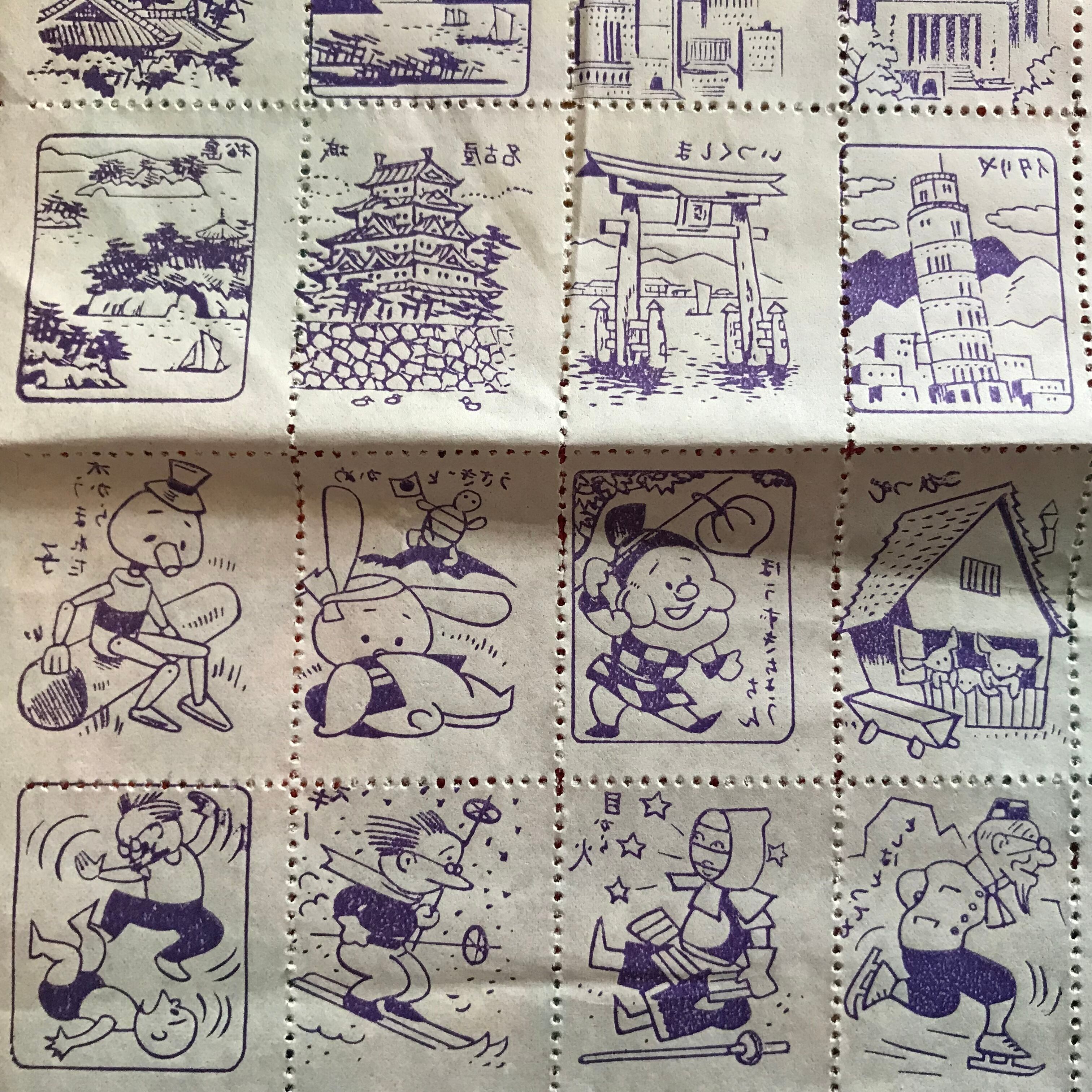 イラストは、赤胴鈴之助や名所名跡をはじめ、ドクロ、おでぶさん、サイドカー、とんねる名人、としはとっても、目から火、等々、かなりノンジャンルです。