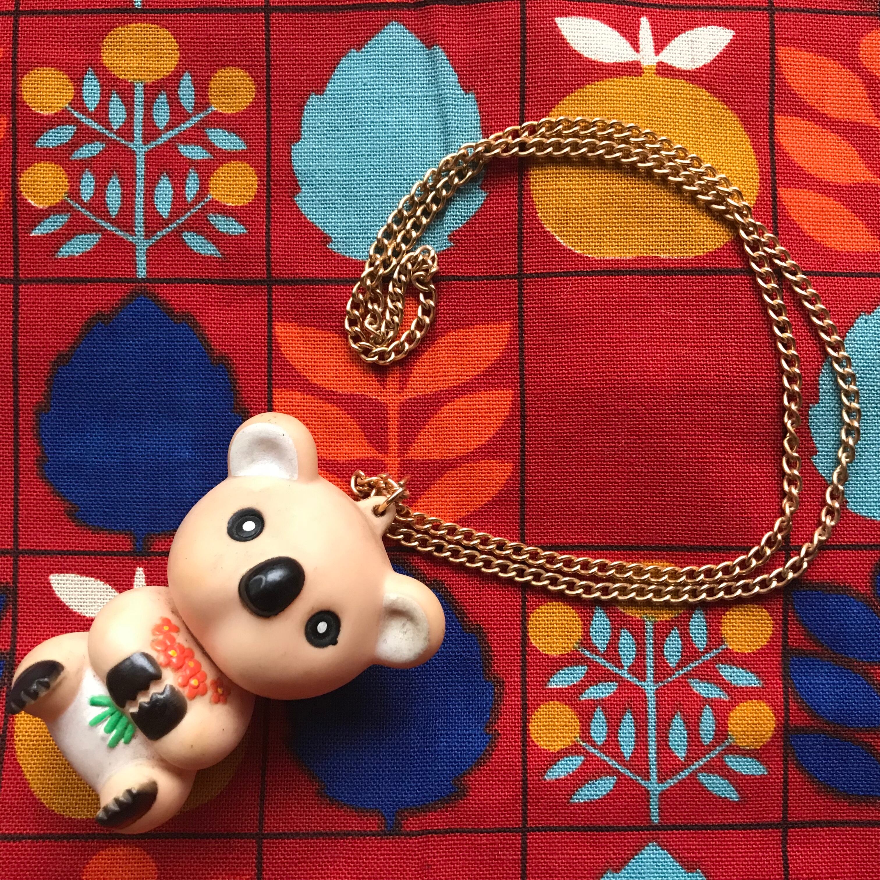 でっかい存在感…こあらソフビのネックレス。無表情が可愛い、昭和レトロ