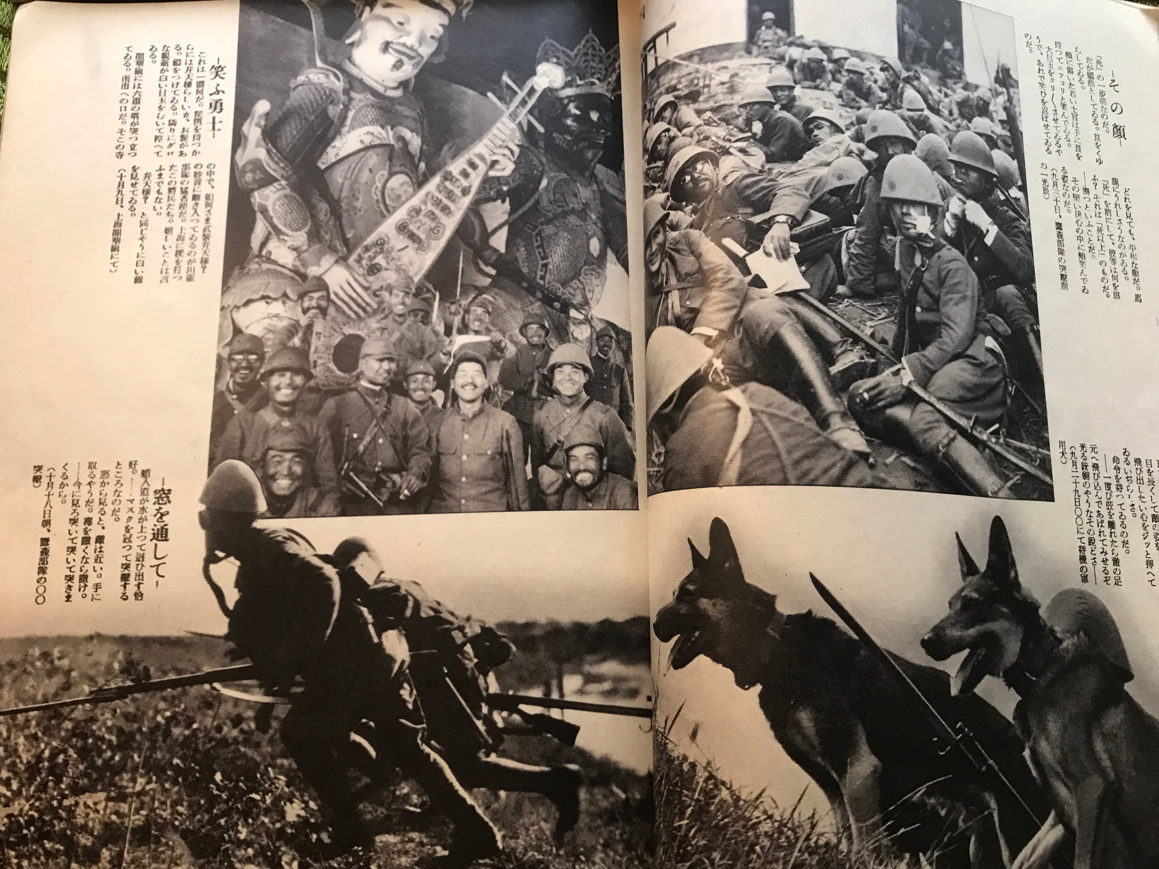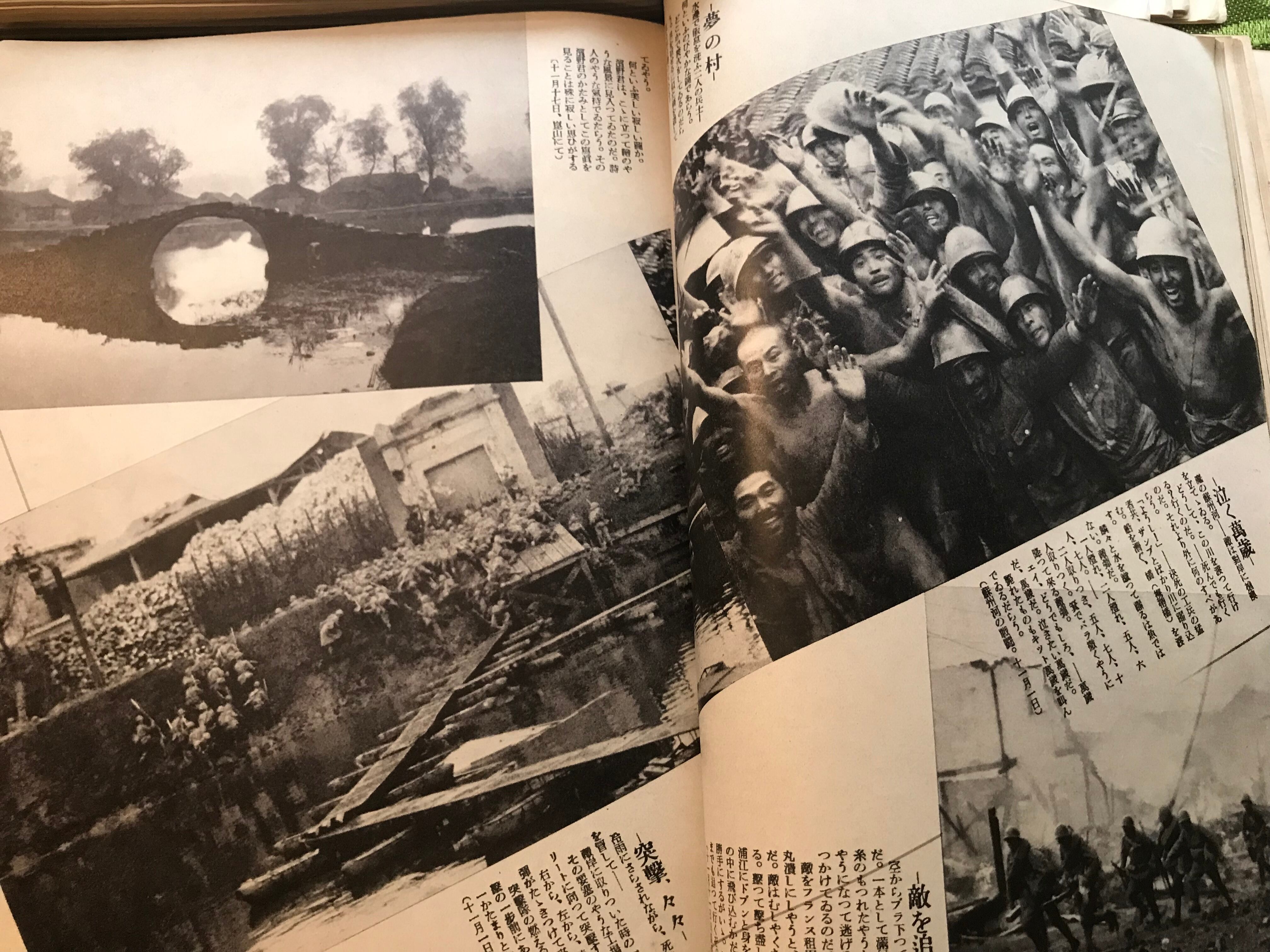 故濱野君の「戦争したフイルム」と題された特集では、南京入城直前に戦死したという26歳の従軍カメラマン『濱野君』が遺した、南京へと進軍する中でのスナップが、16ページ渡り紹介されています。歴史の是非をさておく事はできないと分かっていながらも、資料としてとても胸にせまるものがあります。戦闘の様子だけでなく、若い兵士が休憩していたり鳥を捕まえて笑顔を見せていたり、これも1つの青春だったのだと感じるような風景があります。