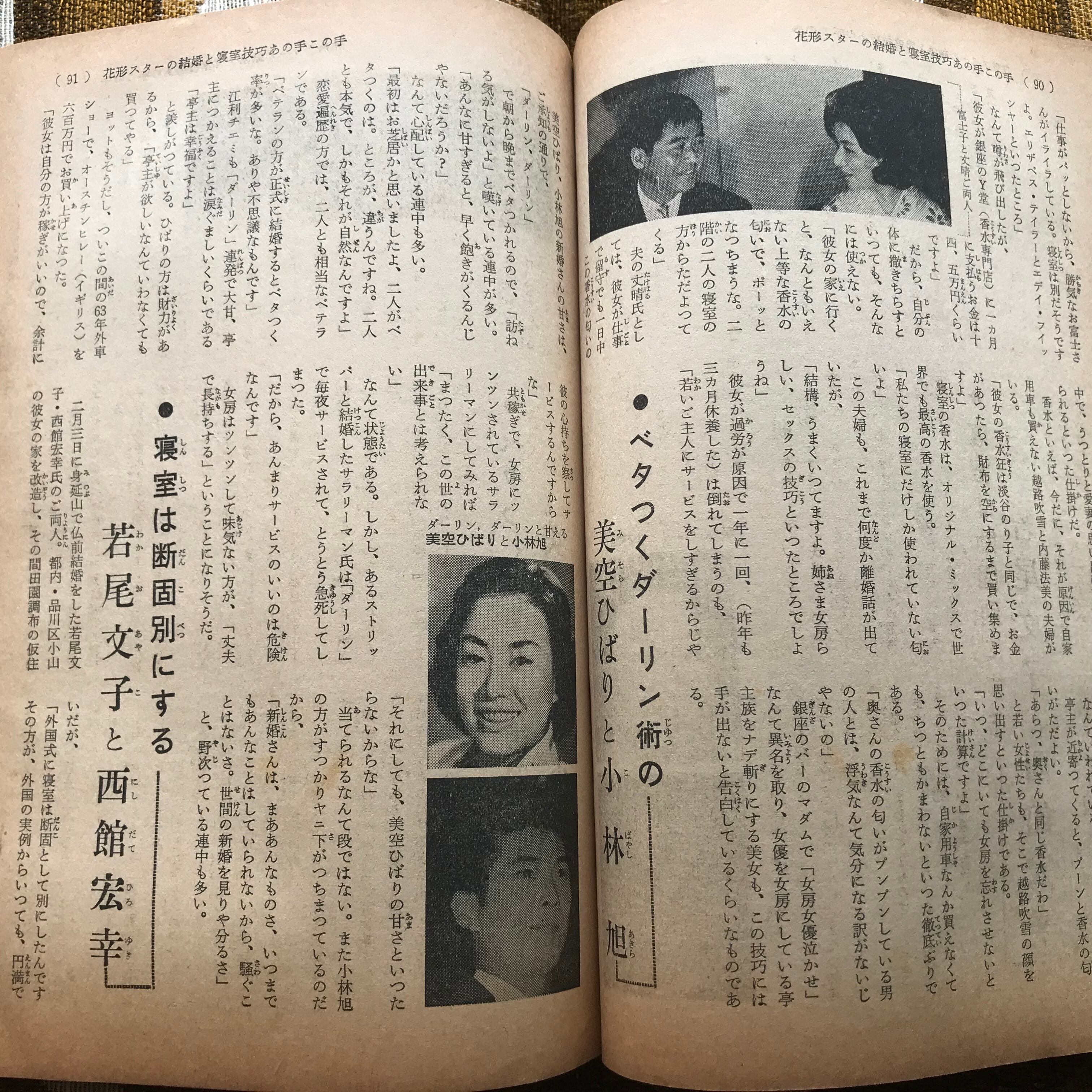 記事「花形スター 結婚とベッドテクニック あの手この手」なんかは、『特製ベッドの徹夜組 嵯峨美智子と岡田真澄』『昼休みを情事に利用する ミッキーと芳村真理』など、本当に100%下衆の勘繰りすぎて笑えます。