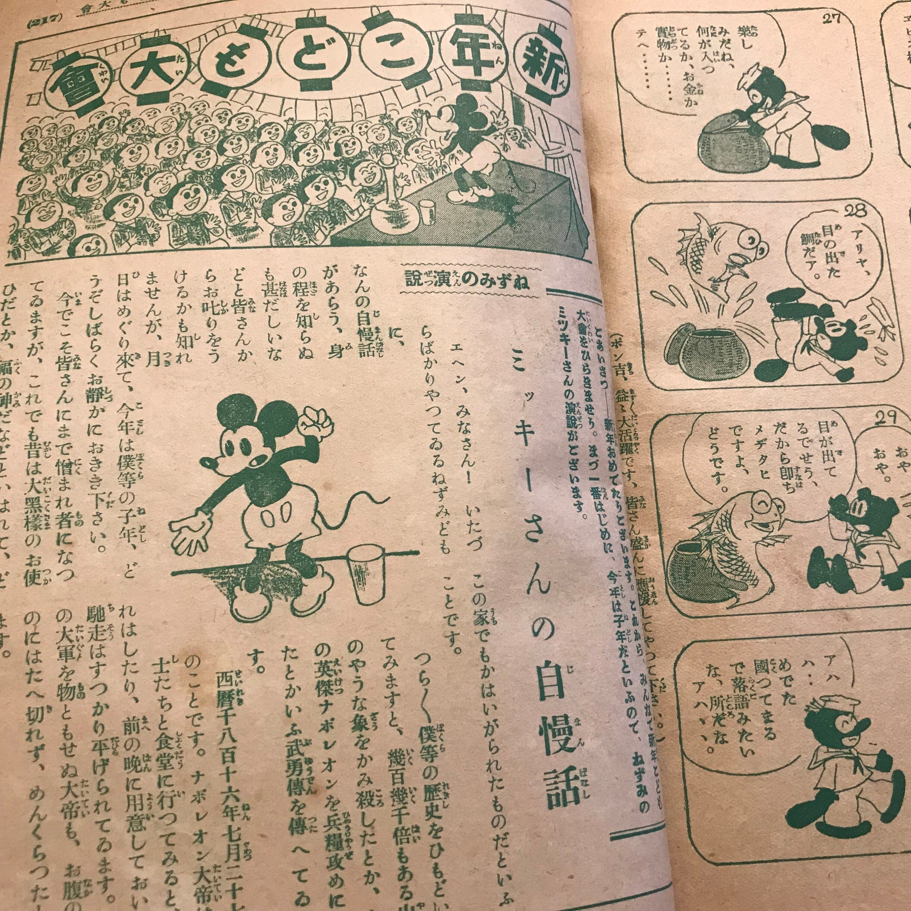 そして巻末にはなんと、子年ということで、「ねずみの演説 ミッキーさんの自慢話」が。ディズニーには相談してないんだろうなあ、と思いつつ読み進めると、『僕等ほど仲間を増やすことのすばやいものは又とありますまい』と自慢してたりして、ああやっぱりディズニーには相談してないと笑えます。