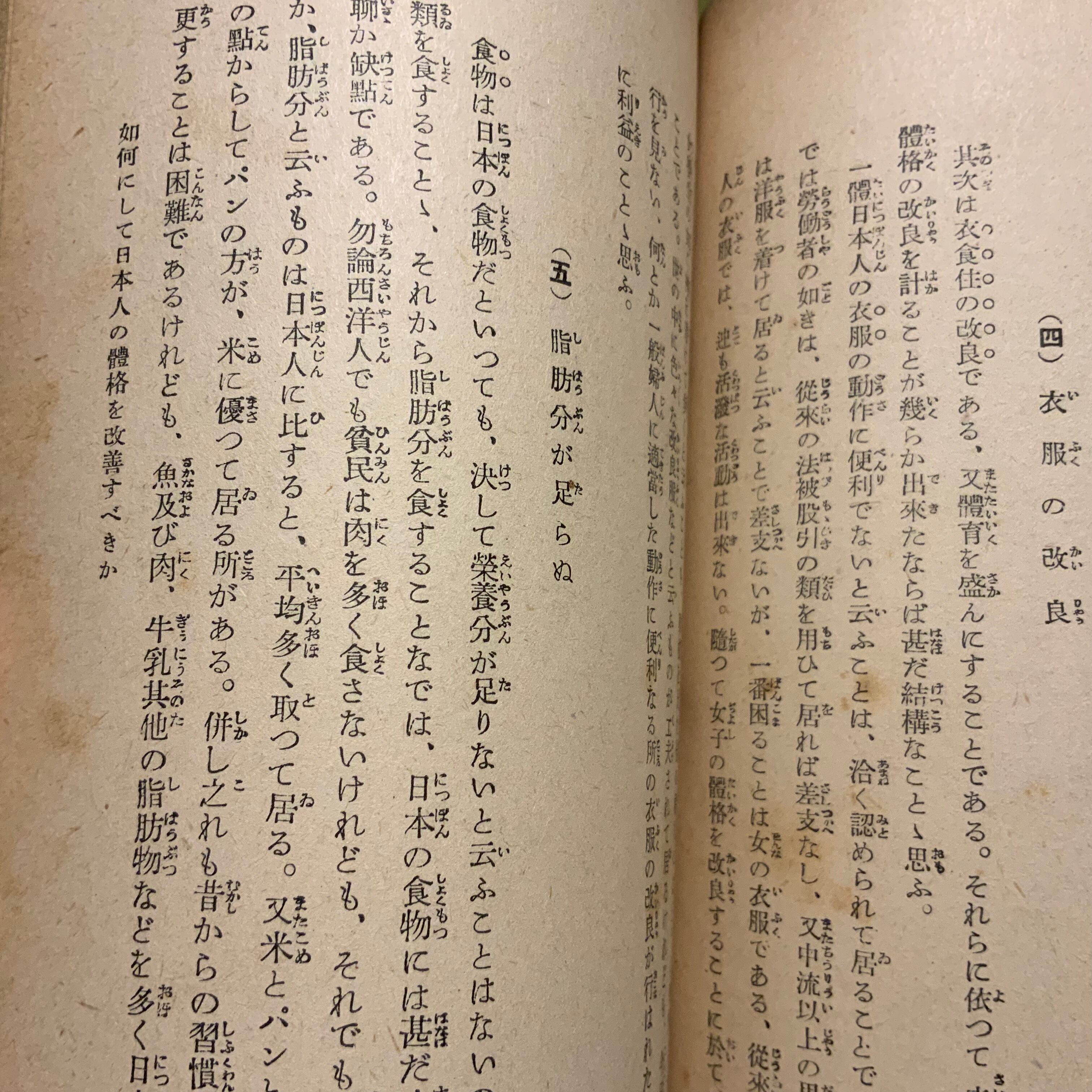 盧溝橋事件から2年、真珠湾攻撃まで2年の昭和14年、列強に比べ体格や丈夫さに劣る日本人に向け、どうにかして強く大きく丈夫にならねばという、鬼気迫る啓蒙書です。
