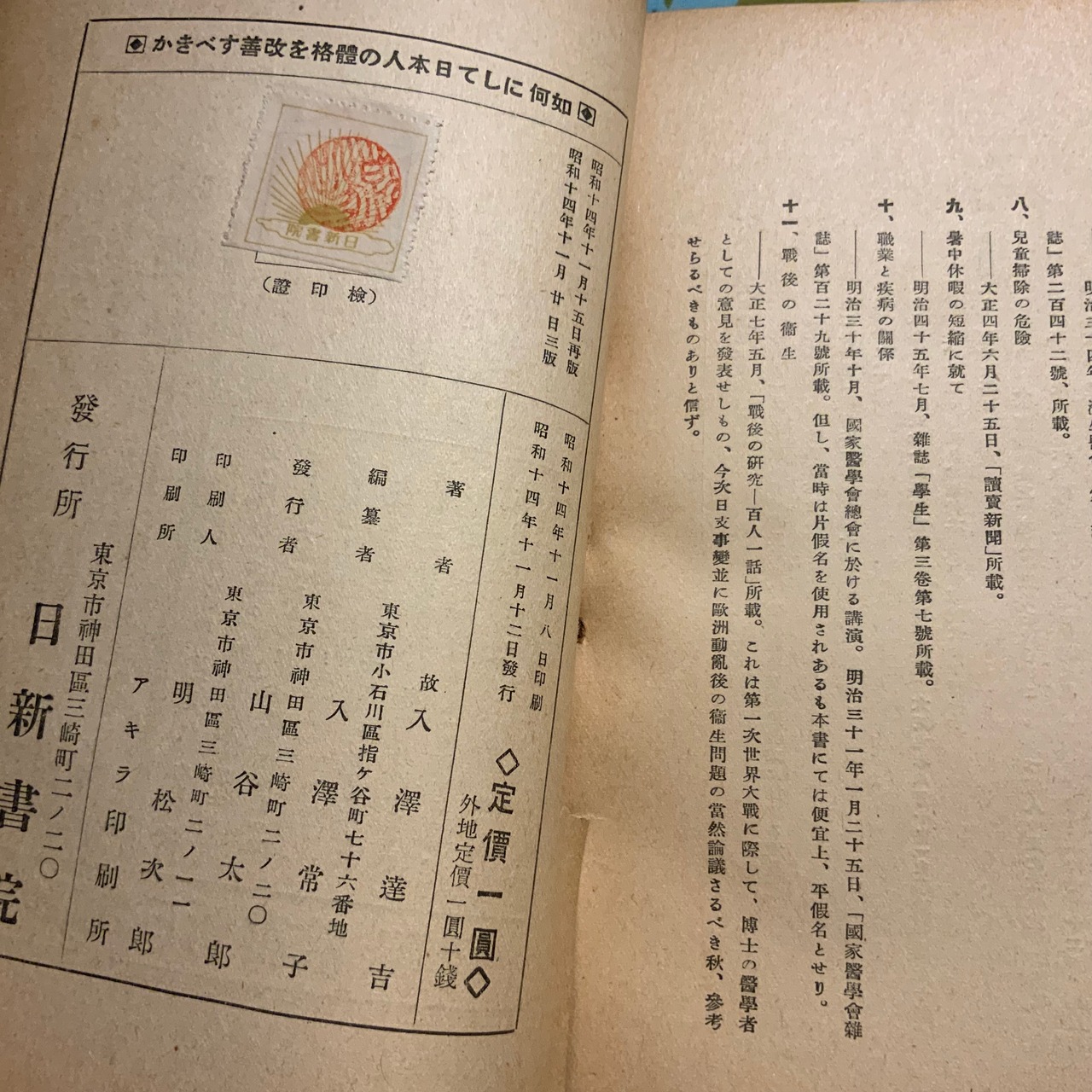 開戦前夜! 昭和14年「如何にして日本人の體格を改善すべきか」醫学博士入澤達吉著 日新書院