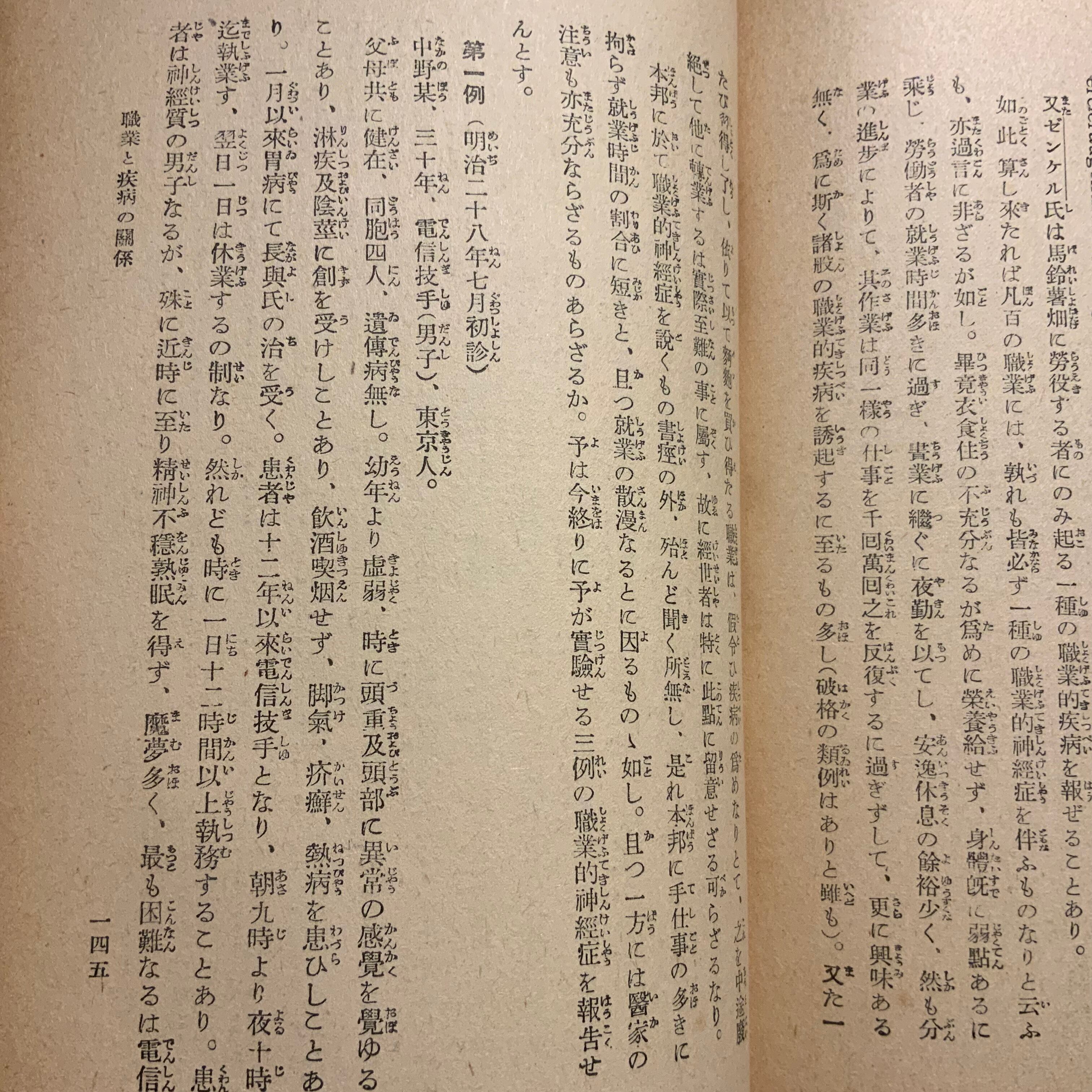 巻末「職業と疾病の関係」の項では、『明治28年初診 電信技手 東京人』『明治29年初診 餝職 東京人』『明治29年初診 車夫の妻 東京人』についての症例がお読みいただけます。