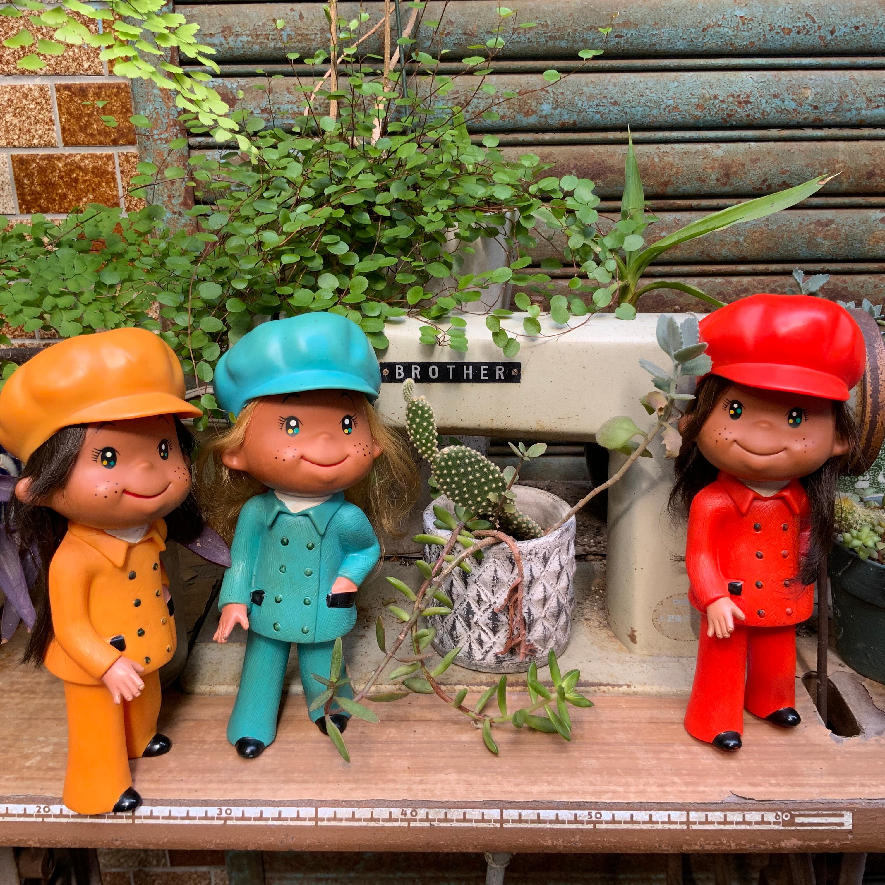 キャスケット&レトロパンツスーツの女の子3人組。おしゃれ昭和人形。ソフビです。