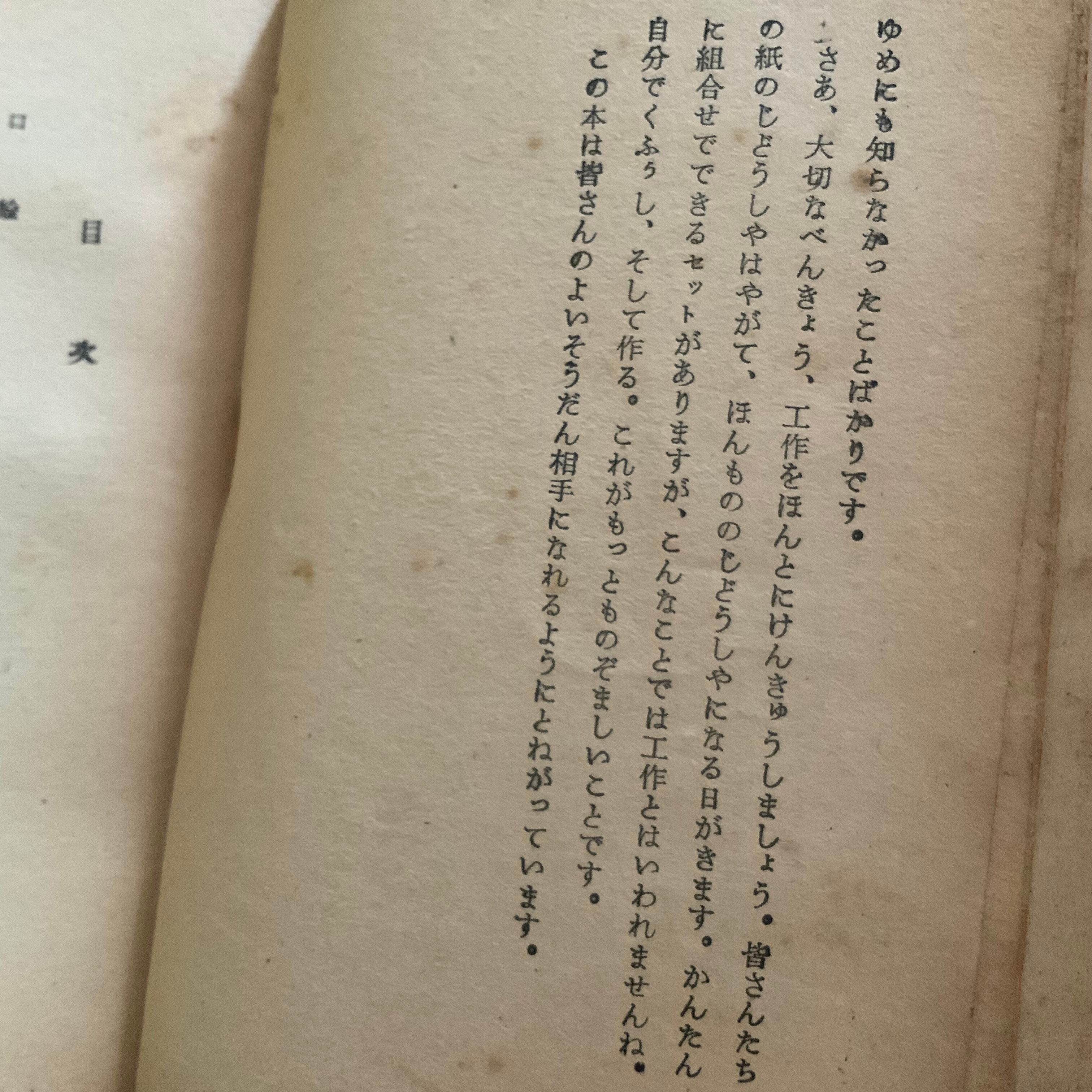 『さあ、大切なべんきょう、工作をほんとにけんきゅうしましょう。皆さんたちの紙のじどうしゃはやがて、ほんもののじどうしゃになる日がきます。自分でくふうし、そして作る。これがもっとものぞましいことです。