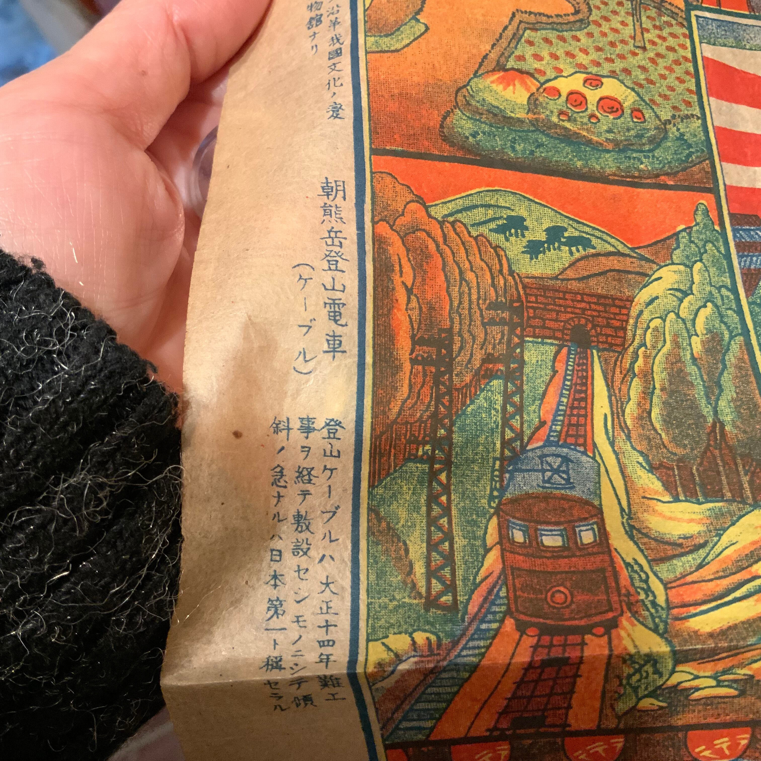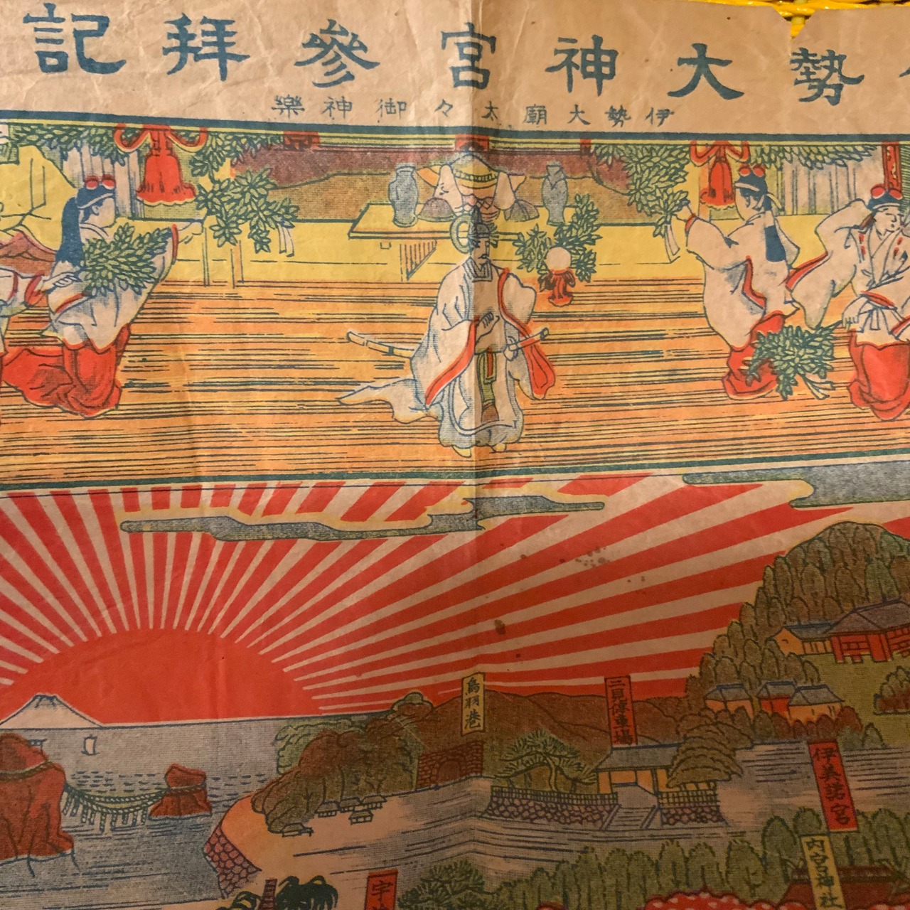 中央にドーンと展開する、伊勢名所史料は、路面電車や往来の人々、人力車、山田駅前の賑わいもきれいに描かれていて、とても良いです。