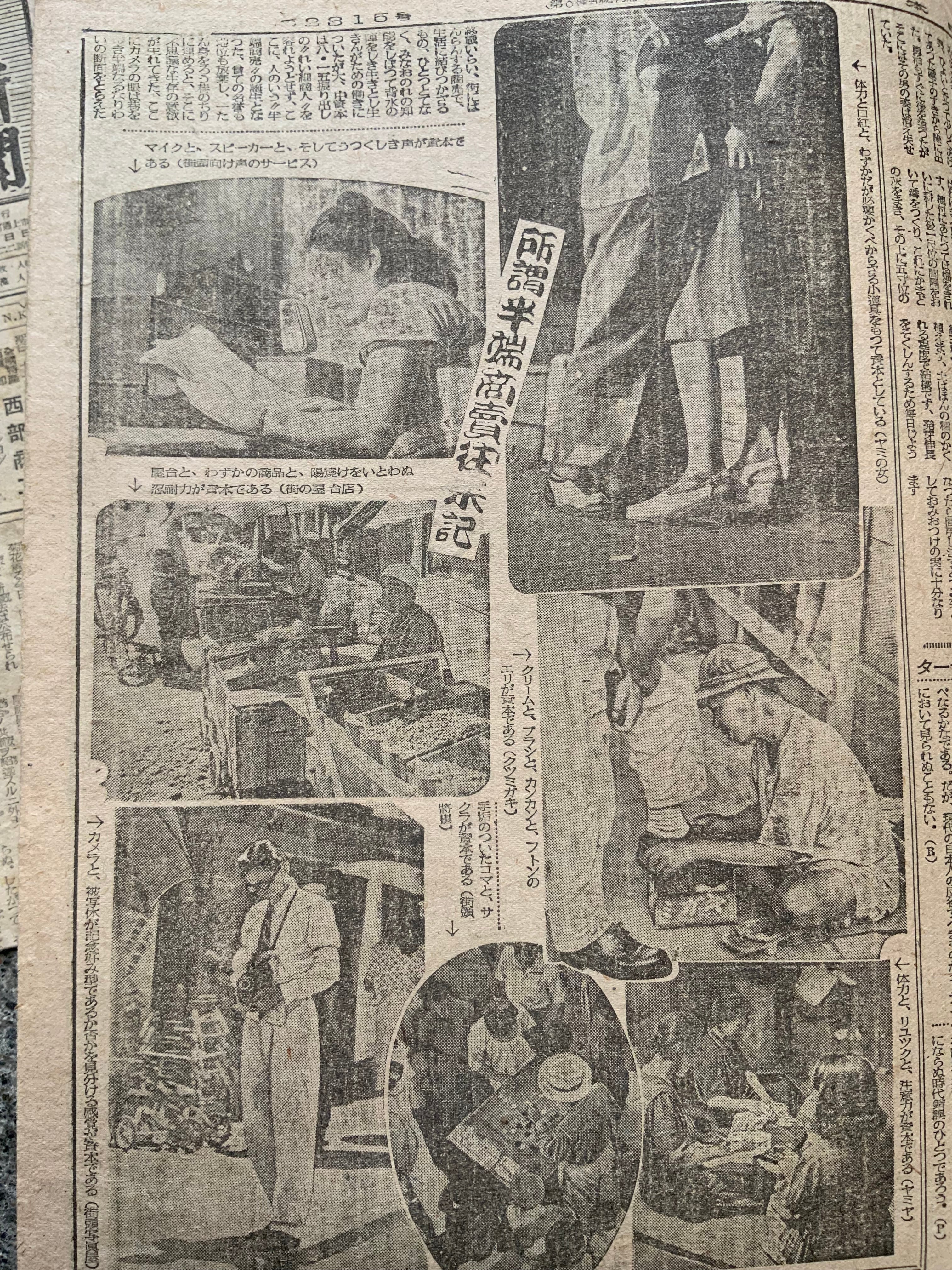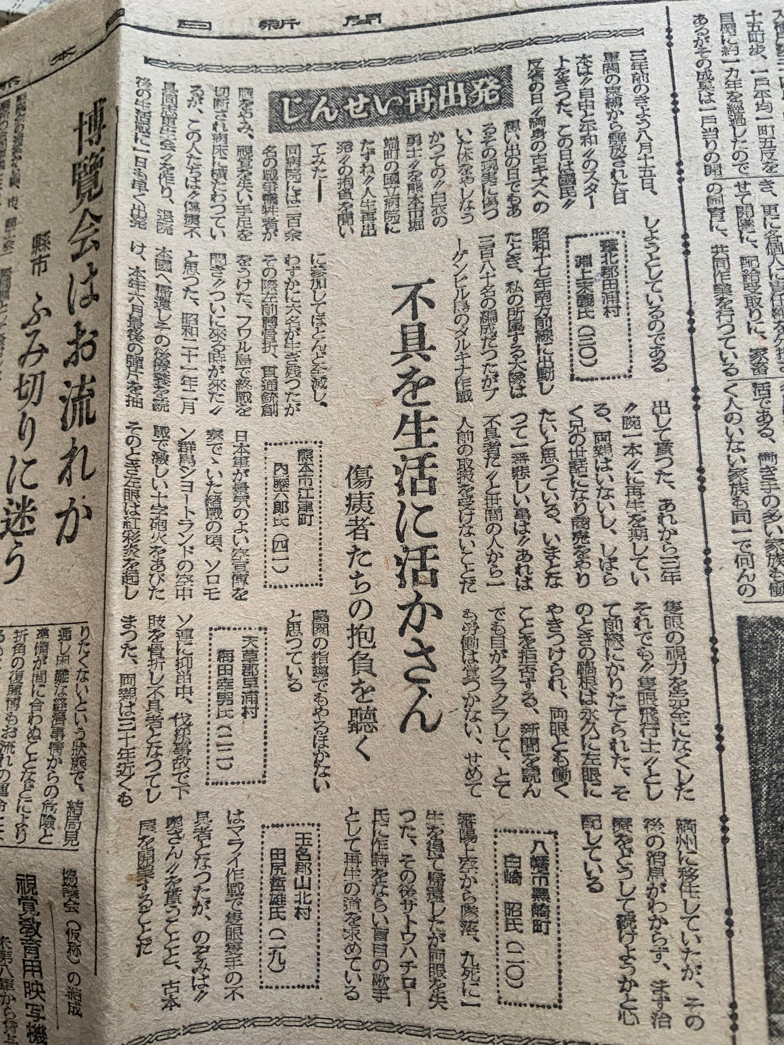 「今日終戦三周年 進歩的中道歩まん」「新日本を育むマ元帥」「百五十万トン 米食糧供給を予定」「米軍南鮮に残留」「博覧會はお流れか 県市ふみ切りに迷う」)じんせい再出発 不具を生活に活かさん 傷痍者たちの抱負を聴く」「所謂半端商売往来記」など