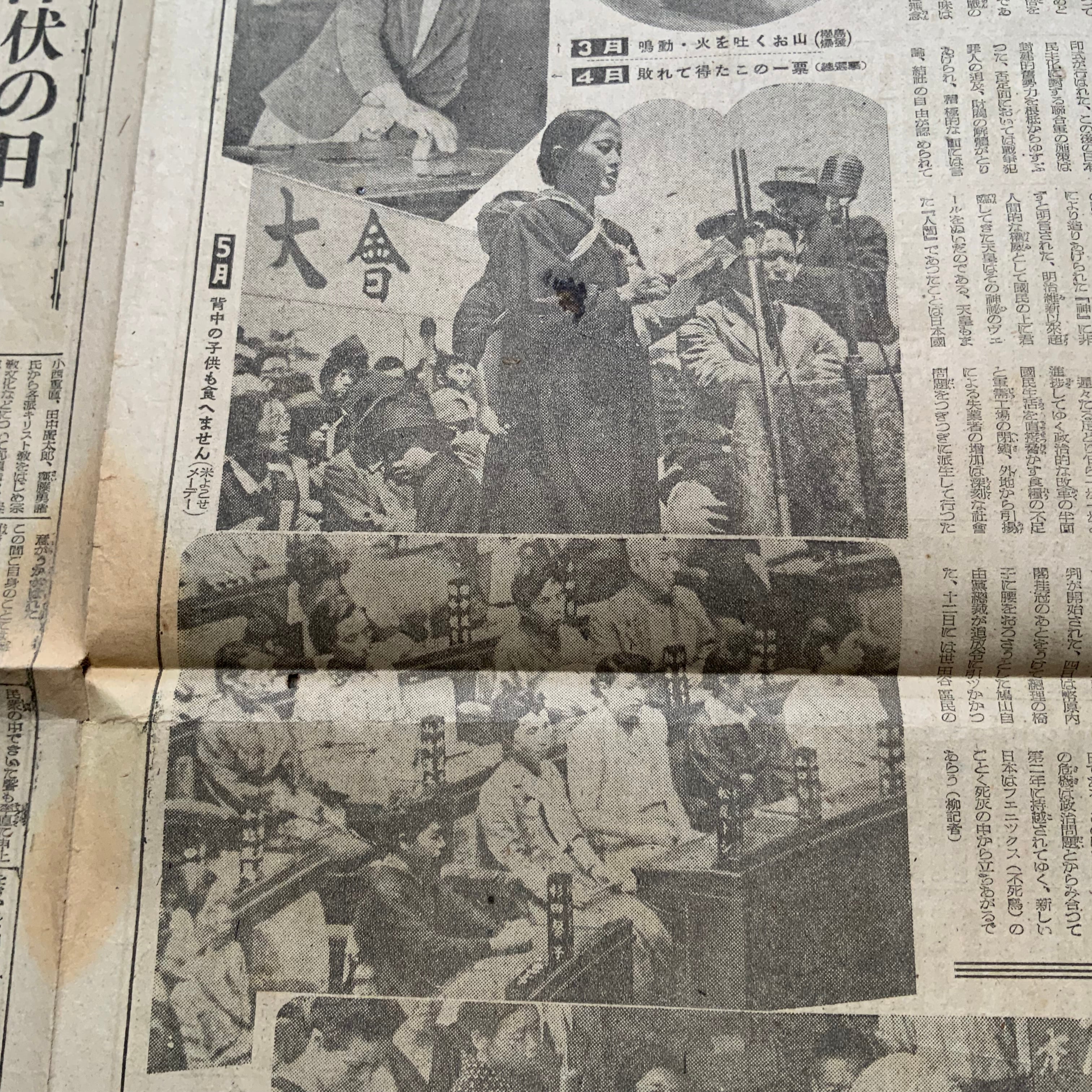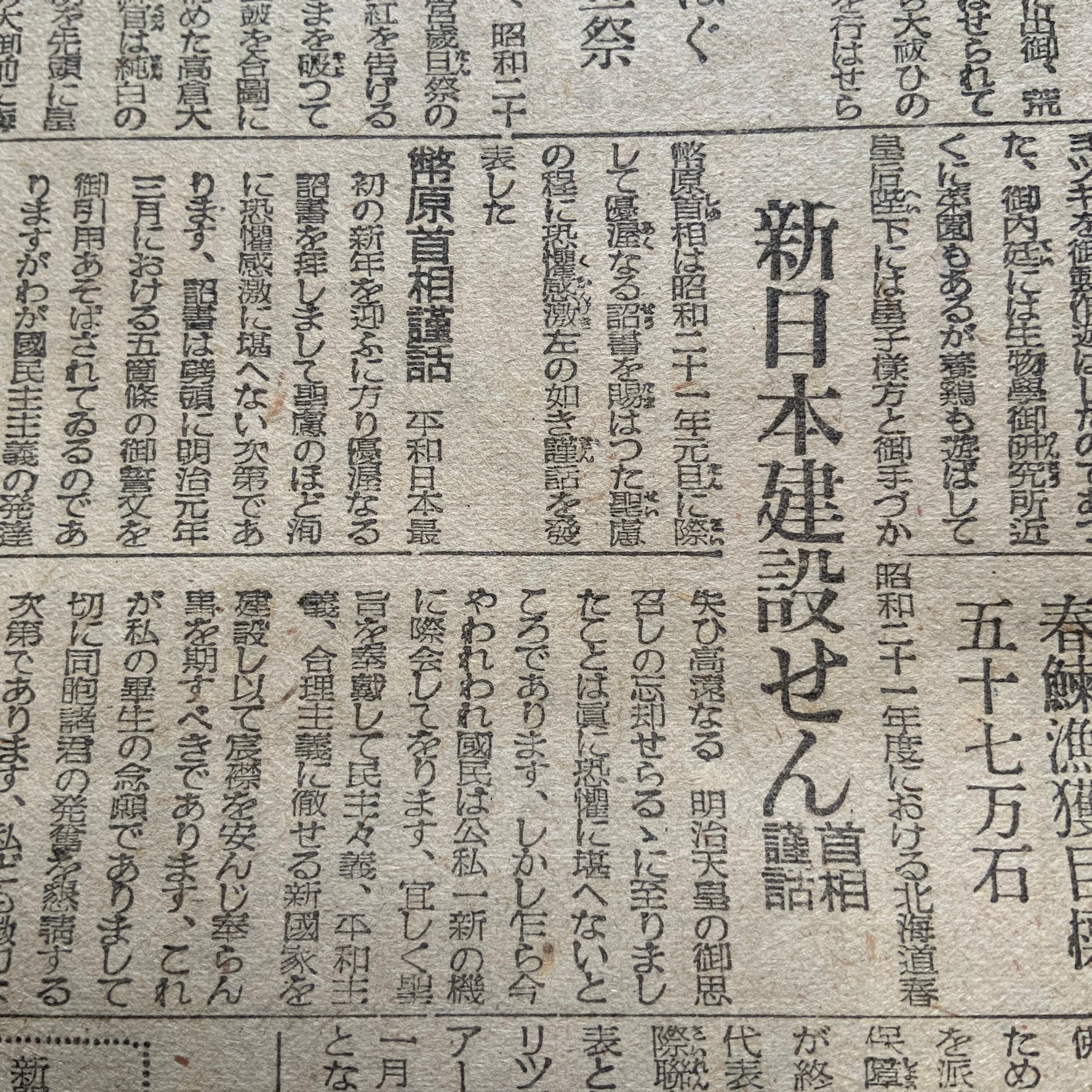 「朕国民と共に在り」「難苦克服に御垂範」「為さねばならぬ事実に目覚めよ マ元帥年頭に声明」「新日本建設せん」「食糧事情等御下問」「インフレを促進 生必品統制撤廃不許可」「町内会単位がよい 防犯自衛団の結成」「女性解放」など